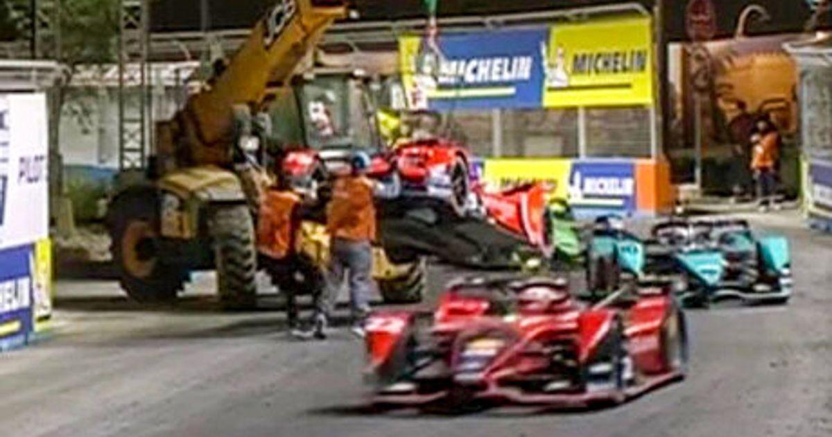 Грандиозный фэйл электро-«Формулы»: болиды пустили прямо под трактор для эвакуации. Разминулись буквально в сантиметрах
