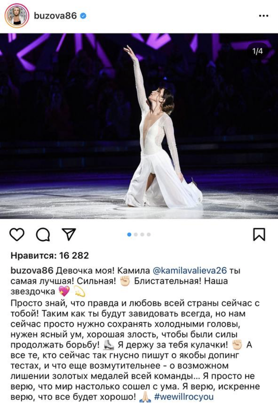 «Девочка моя! Камила, ты самая лучшая! Сильная! ✊🏻 Блистательная! Наша звездочка 💖 💫 Просто знай, что правда и любовь всей страны сейчас с тобой! Таким как ты будут завидовать всегда, но нам сейчас просто нужно сохранять холодными головы, нужен ясный ум, хорошая злость, чтобы были силы продолжать борьбу! ⛸ Я держу за тебя кулачки! ✊🏻 А все те, кто сейчас так гнусно пишут о якобы допинг тестах, и что еще возмутительнее - о возможном лишении золотых медалей всей команды… Я просто не верю, что мир настолько сошел с ума. Я верю, искренне верю, что все будет хорошо! 🙏🏻 #wewillrocyou»