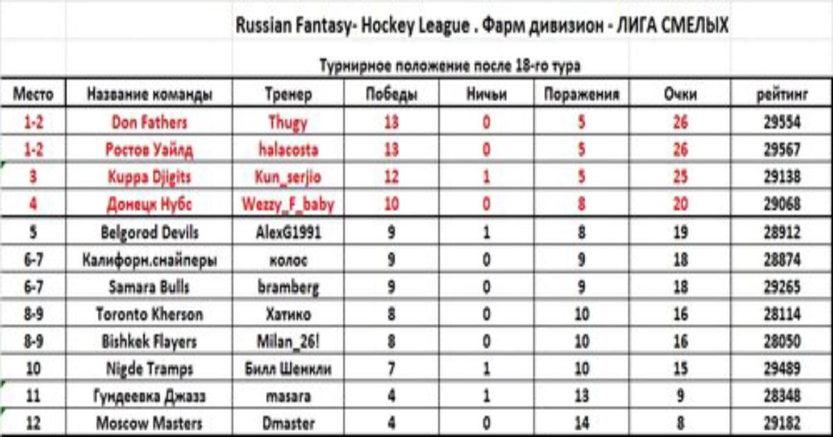 Поздравим с победами Алекса1991, Милана 26! и, особенно Билла Шенкли. Во втором круге его Нигде Трампс чувствуют себя просто замечательно, одержав пять побед в семи матчах. С возвращением в борьбу за выход в Главную Лигу, Билл! Пять очков отыграть вполне реально, ведь впереди еще 15 туров. Аутсайдеры – Дмастер и Масара – похоже, лишаются шансов на итоговый успех. Очень уж удручающе смотрятся их результаты в турнирной таблице.