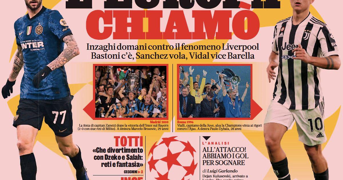 «Европа зовёт» – таким заголовком Gazzetta рассказывает о возвращении Лиги Чемпионов: «Вот снова Лига Чемпионов. «Интер» и «Юве» хотят вернуться к величию. Индзаги завтра против феномена «Ливерпуля». Бастони сыграет, Санчес летит, Видаль – вице-Барелла». Также миланское издание поговорило с экспертами: «Тотти: «Как интересно с Джеко и Салахом: голы и фантазия», «Инс: «Я снова спою песни на «Сан Сиро». С «красными» будет тяжело».