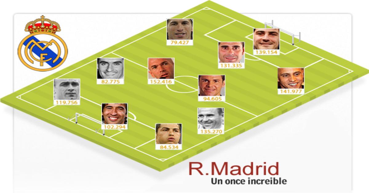 По случаю 110-тилетия Королевского клуба издание MARCA провело опрос среди читателей на своей странице в интернете с целью выяснить, каким же болельщики видят идеальный состав "Мадрида" – лучшего клуба XX века. Вот такой получилась, по мнению читателей, идеальная команда, составленная из сильнейших игроков Королевского клуба разных эпох: Икeр Касильяс, Роберто Карлос, Фернандо Йерро, Сeрхио Рамос, Фернандо Редондо, Зинедин Зидан, Мичел, Ференц Пушкаш, Альфредо Ди Стефано, Рауль и Криштиaну Роналду.