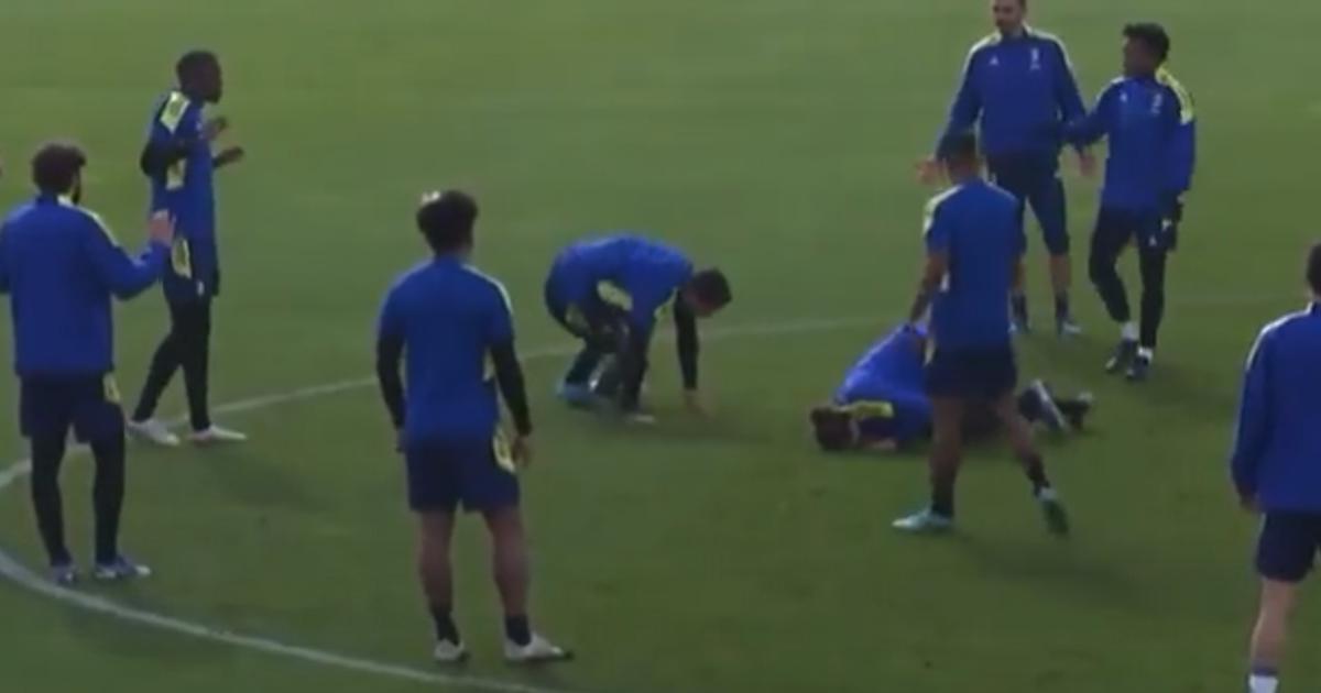 Игрок молодежной команды «Ювентуса» Диего Страмаччони сделал грубый подкат против Адриена Рабьо на тренировке.