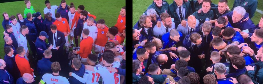 «Взгляните на командное собрание англичан и итальянцев перед, возможно, главными минутами в их жизни: первые выглядят более разрозненными и взволнованными, капитан стоит далеко; каждый думает о том, как бы ему не ошибиться», – заметил спортивный психолог Гейр Жордет. Это пример из матча Англии и Италии в финале Евро.