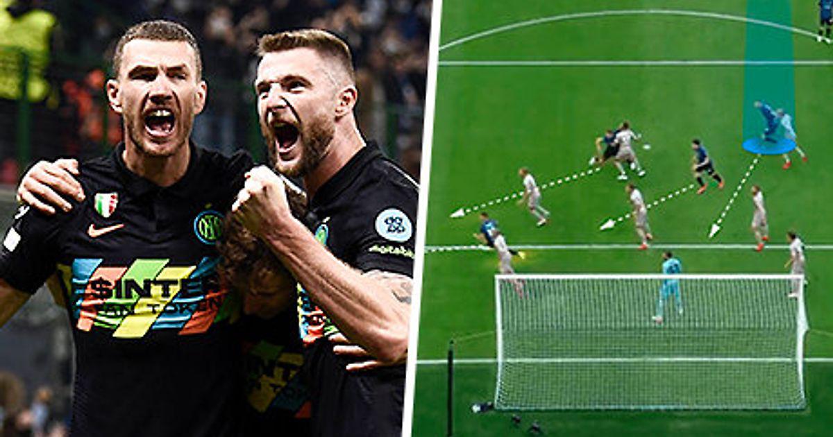 Пример из январского матча против «Венеции». Подачу Хакана Чалханоглу в штрафной ждут шесть футболистов «Интера», из которых пять отчетливо двигаются по направлению к ближней штанге. Шестой – Эдин Джеко (номер 9, самый высокорослый у миланцев в штрафной) – наоборот: после обманного шага влево смещается к дальней.