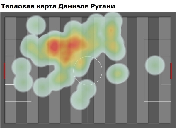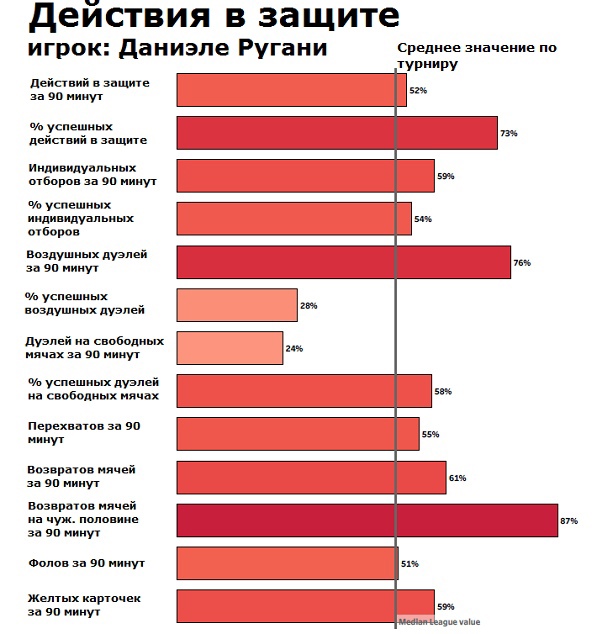 По этому изображению можно проанализировать защитные характеристики Даниэле Ругани по его игре в матче против "Вильярреала" в Лиге чемпионов. По большинству показателей, Ругани демонстрирует результаты выше среднего. Наиболее заметными показателями являются "Действия в защите за 90 минут" и "Возврат мячей на чужой половине за 90 минут". Вместе с тем, Ругани выиграл всего 25% дуэлей в обороне и 30% воздушных дуэлей. Ругани отлично действует позиционно, о чём свидетельствуют показатели "Перехваты за 90 минут" и "Возвраты за 90 минут". Таким образом, именно позиционную игру можно выделить в качестве главного навыка Ругани.