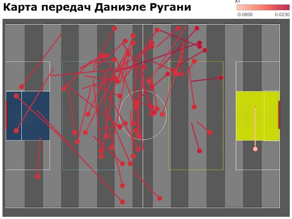 На изображении выше отображены направления передач Ругани. 27-летний защитник уверенно играет в проходах и при владении мячом. Можно сделать вывод, что Ругани делает много передач вперёд, что говорит о его желании отодвинуть игру команды от обороны. Он делает больше передач вперёд, чем фланговые защитники. Кроме того, он сделал несколько длинных передач ближе к штрафной соперника, что говорит о том, что он не боится отдавать такие передачи на половину поля соперника.