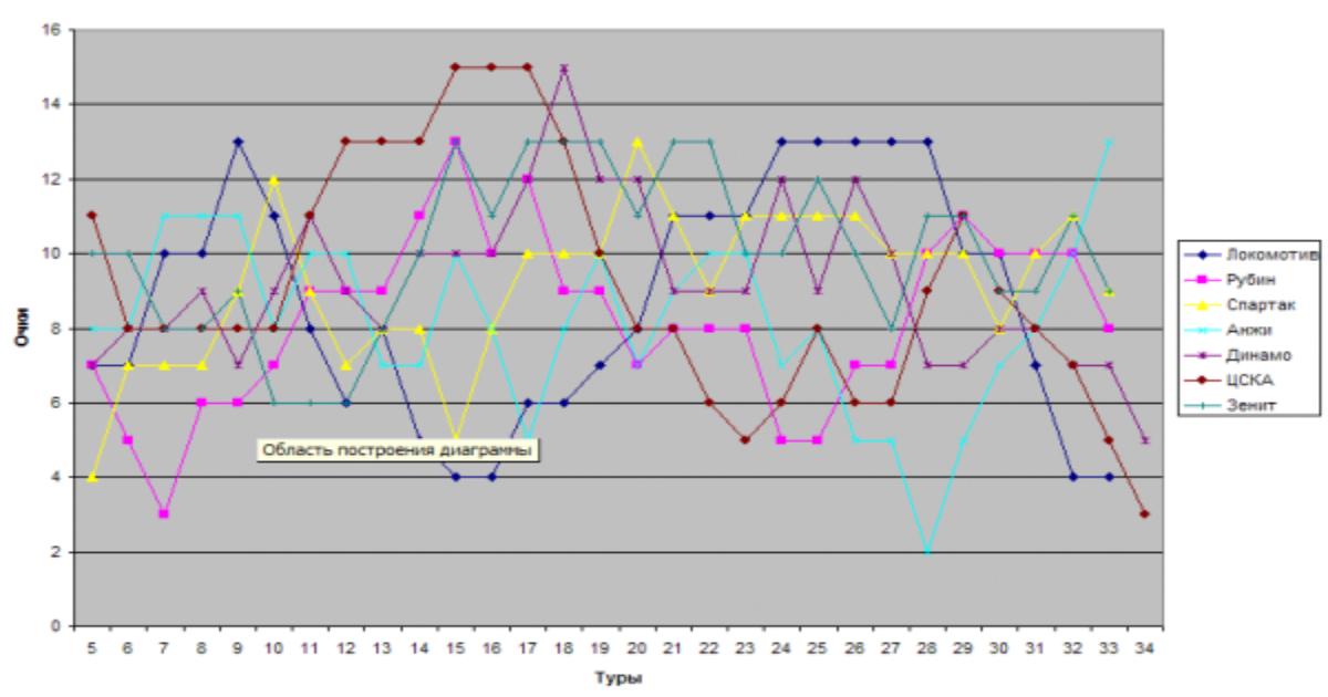 Такой подход позволяет наиболее полно и основательно изучить ход команд по турниру, основываясь на результатах игр в различные периоды времени, но при этом роль случайности (например, нелепого поражения) сведена к минимуму. Как известно, для победы в чемпионате или хотя бы достижения зоны Лиги Чемпионов команде в обычном 30-туровом чемпионате необходимо набрать примерно 55-65 очков, т.е. примерно 60%. Поэтому на всех диаграммах зеленым выделена зона, длительное нахождение графика в которой позволяет рассчитывать на очень хорошие и отличные результаты по итогам сезона.
