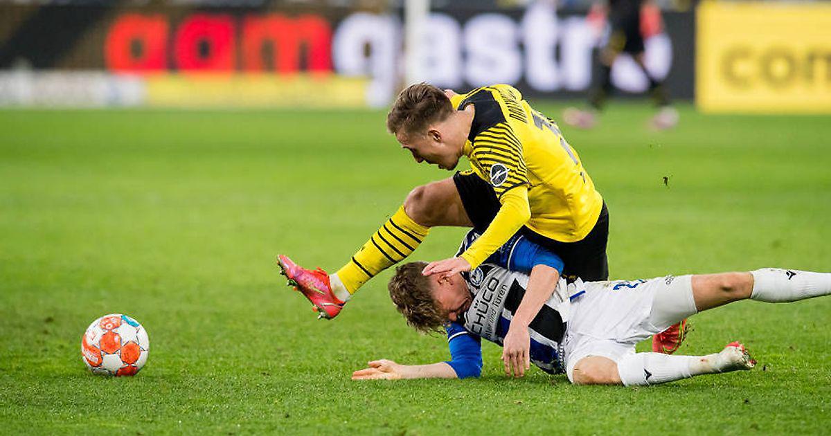 Но «Арминия» тоже не дремала и при первой же возможности старалась искать пути к чужим воротам. На 14-й минуте Окугава в окружении четверых игроков в черно-желтой форме с 16 метров пробил прямо в Кобеля. А на 15-й минуте после розыгрыша углового Шепф с правого фланга навесил в штрафную на набегавшего Ласма, который опередил опекавшего его Витселя и с 9 метров головой пробил в руки Кобелю.
