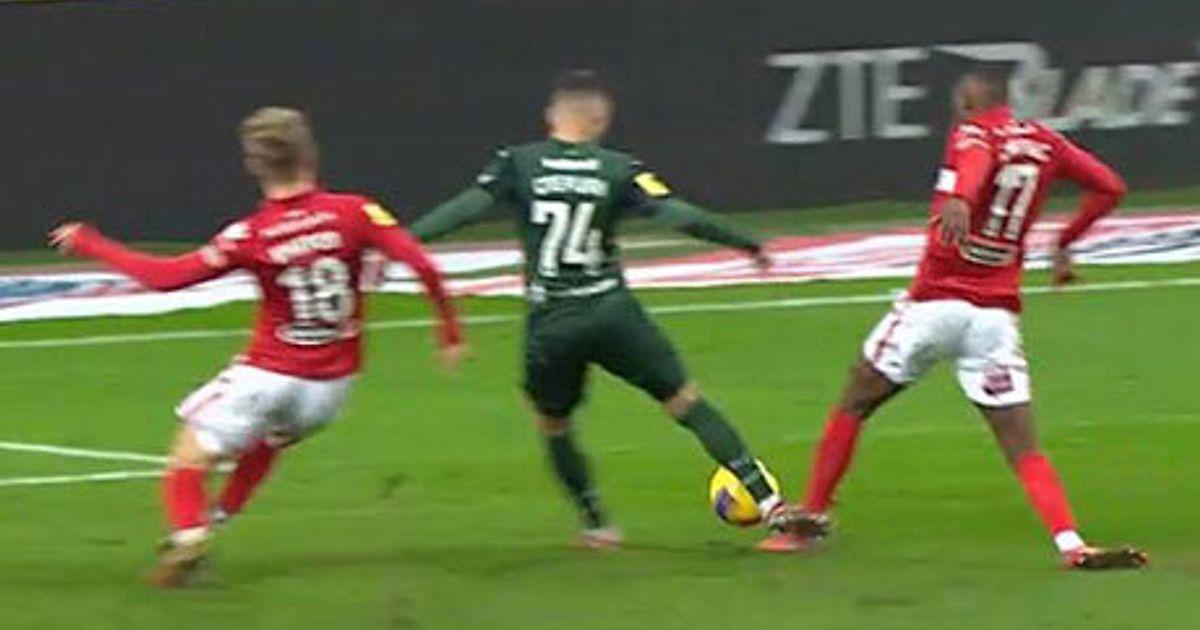 Мотивировка: игрок обороняющейся команды Кристофер Мартинс при попытке сыграть в мяч не дотянулся до него, а атакующий игрок Эдуард Сперцян, который пытался ударить по воротам, коснулся ноги соперника вскользь в тот момент, когда она уже находилась на газоне.