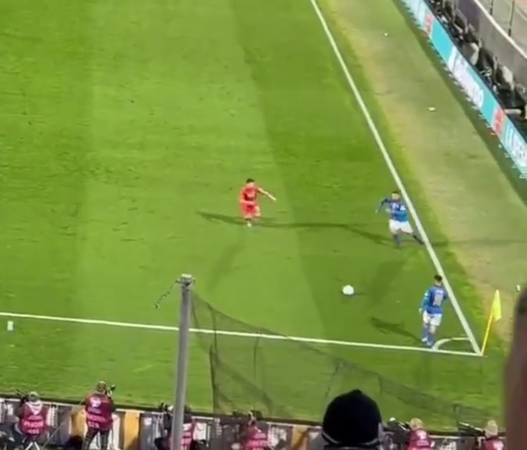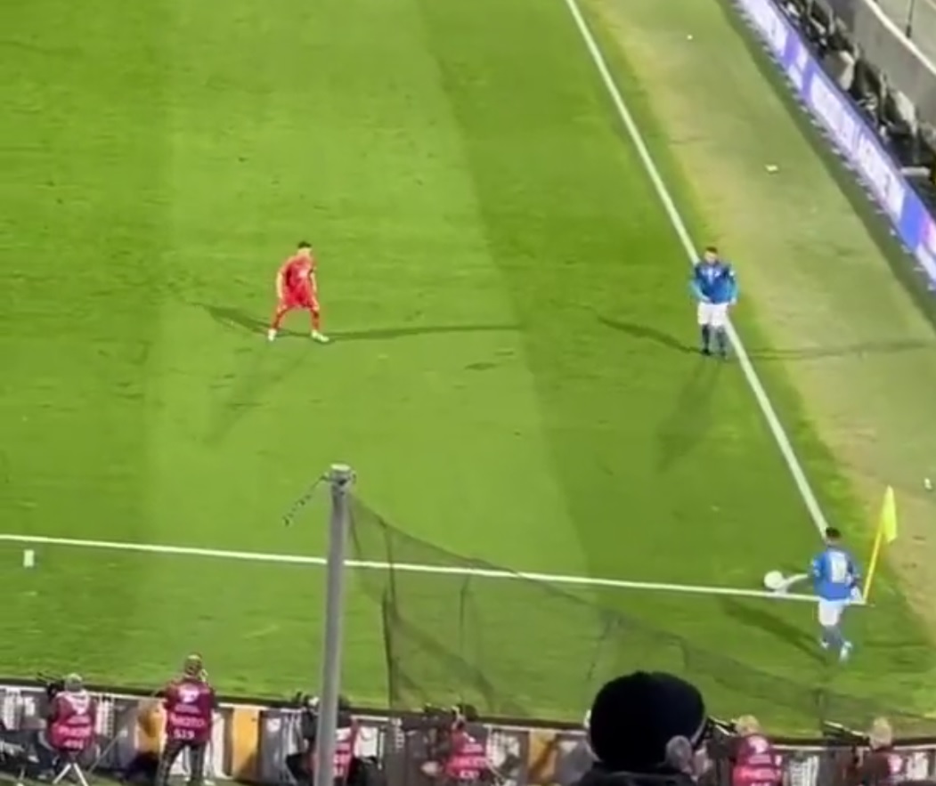 Капитан «Наполи» хотел разыграть мяч с партнером, но зачем-то покатил мяч на стоявшего рядом македонца. Который и перехватил мяч.