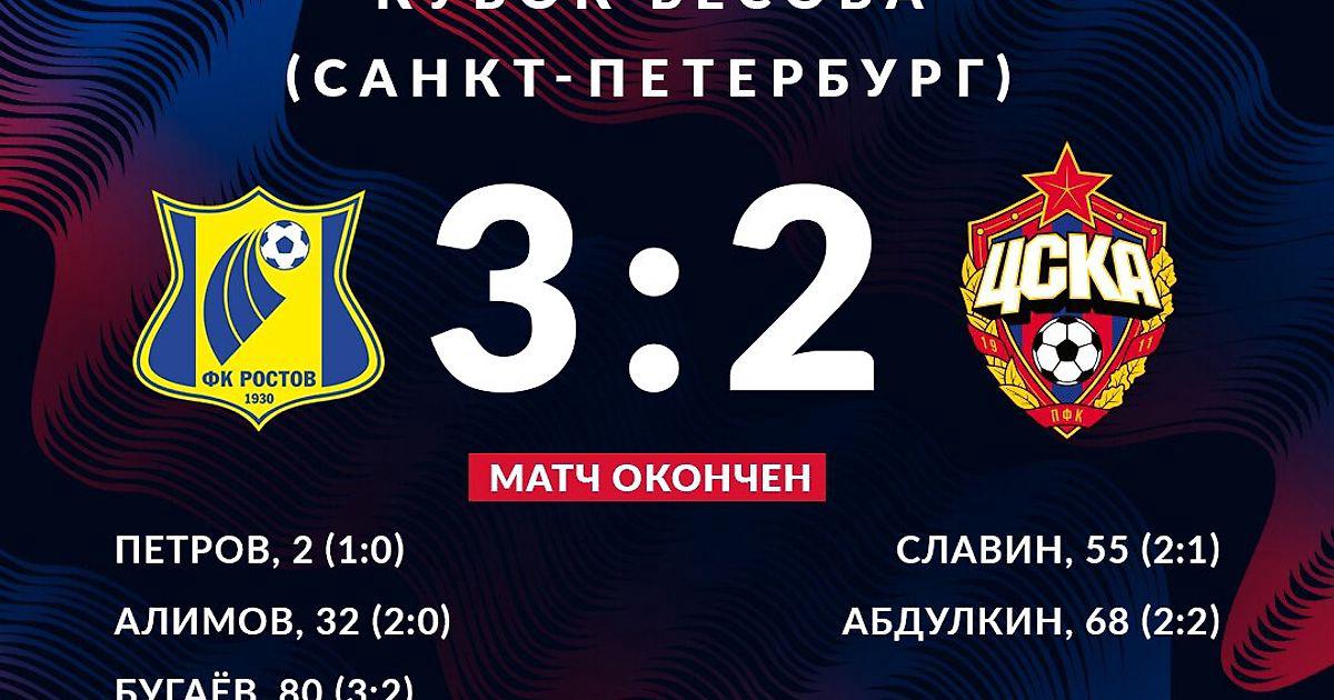 На проходящем в Санкт-Петербурге Кубке Дмитрия Бесова команда ДЮСШ ПФК ЦСКА 2006 года рождения (старший тренер — Валерий Минько) сыграла сверстниками из «Ростова». Красно-синие уступали по ходу матча 0:2, во втором тайме смогли отыграться, но пропустили уже в компенсированное время после подачи с углового. В заключительном матче Кубка армейцы сыграют с хозяевами турнира — «Зенитом». Матч состоится 27 марта в 13:10. Кубок Бесова 2-й тур «Ростов» — ПФК ЦСКА — 3:2 Голы: Петров, 2 (1:0). Алимов, 32 (2:0). Славин, 55 (2:1). Абдулкин, 68 (2:2). Бугаев, 80 (3:2). ПФК ЦСКА: Баровский, Уткин (Жуков, 38), Горожанов (Станисавлевич, 38), Соколов, Поляков, Ефремов (Абдулкин, 38), Мхитарян (Свансон, 38), Савин, Меркулов (Попов, 38), Ромашин (Дударин, 38), Михай (Славин, 38). Матчи Кубка Бесова проходят в формате двух таймов по 40 минут.
