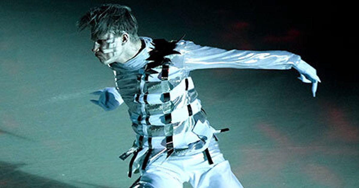Морозный концерт нашего фигуриста: покрасил волосы и лицо в белый, надел стальной костюм и выдал брейк на льду