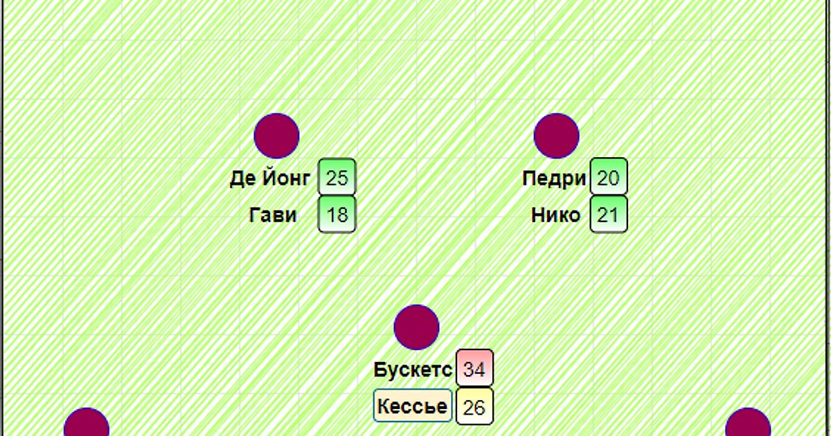 На каждой позиции на поле будут 2-3 футболиста. Первым указан тот, кому я отдаю предпочтение на конкретной позиции. Справа от имени показано, сколько лет будет игроку в сезоне 22/23. Отдельными цветами выделены футболисты, которых Барса может подписать (или подписала) в качестве свободного агента или купить этим летом.