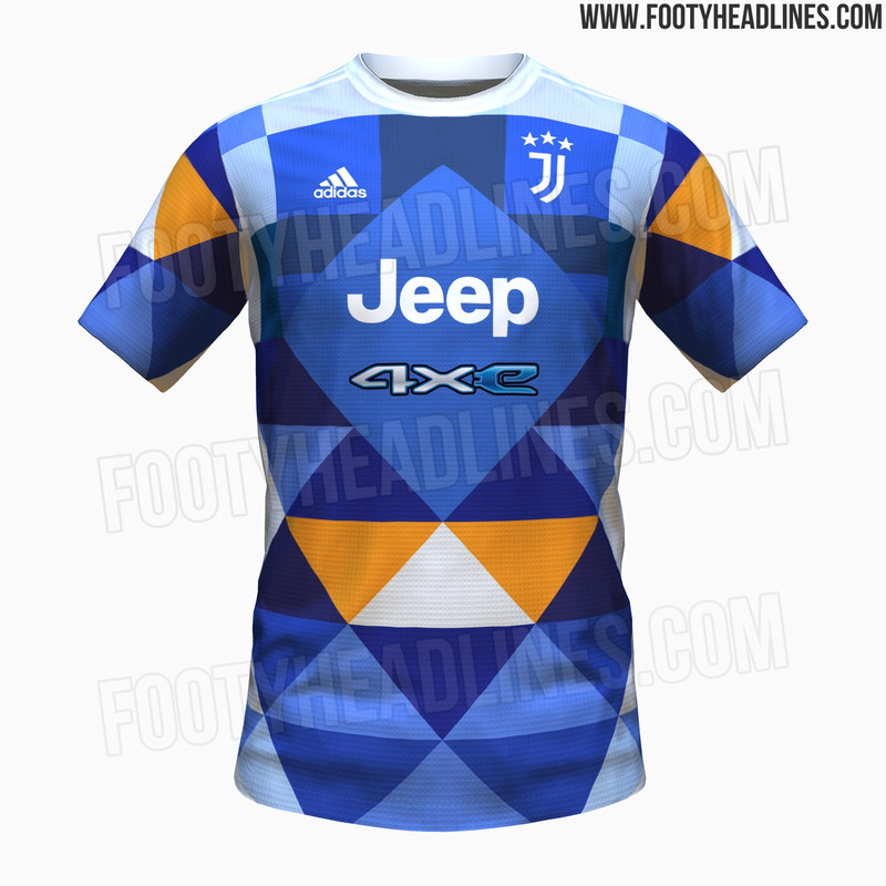 Четвертая футболка Adidas x Kobra Juventus 2021-22 имеет яркий геометрический рисунок с прямоугольниками и ромбами разных оттенков синего и желтого цветов как спереди, так и на рукавах.