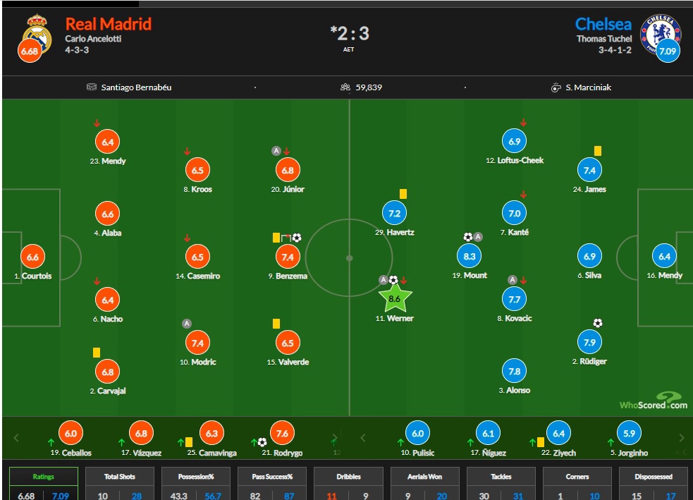 В ярчайшем ответном четвертьфинальном матче Лиги Чемпионов между «Мадридом» и «Челси» на «Сантьяго Бернабеу» хозяева поля все-таки сумели одержать верх. «Челси» совершил невероятный камбэк, сначала сравняв счет после голов Мэйсона Маунта и Антонио Рюдигера, а потом Тимо Вернер на 75 минуте вывел свою команду вперед.