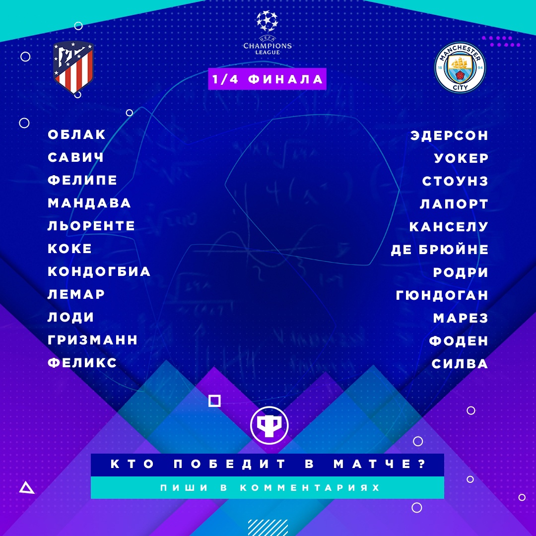 В составе Атлетико явных изменений по сравнению с прошлым матчем мы не заметим,но стоит нам взглянуть на состав Сити,как эти изменения бросаются в глаза.В первом матче Гвардиола выпустил 3 ярко выраженных центральных защитника( Аке,Ляпорт,Стоунз).Кансело же был не фланговым защитником,а латералем,наравне с Бернарду Сильвой.Но,что же было у Манчестера в этом матче? Здесь уже Пеп выпустил 2 центральных защитников(Ляпорт и Стоунз).Но,суть в том,что в первом матче Сити играли в 3 защитника,в уже в этом матче в 4 защитника в линию(Кансело-Ляпорт-Стоунз-Уокер).Центр поля у команд остался без изменений.Симеоне нападение оставил прежнее(Гризманн и Феликс),в то время,как испанский специалист выпустил вместо Стерлинга Фодена,который стал играть роль ложной девятки.