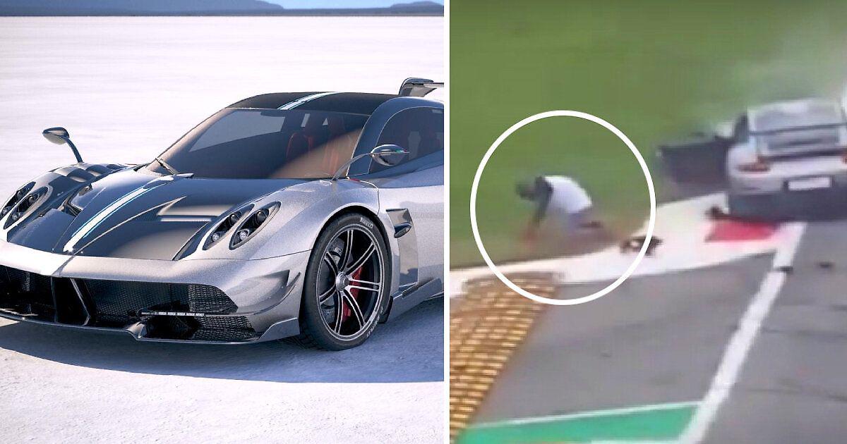 На записи видно, как в повороте бок в бок столкнулись Porsche GT2 и Pagani Huayra BC – последняя с повреждениями улетела на газон. Но самое главное – реакция водителя Porsche.