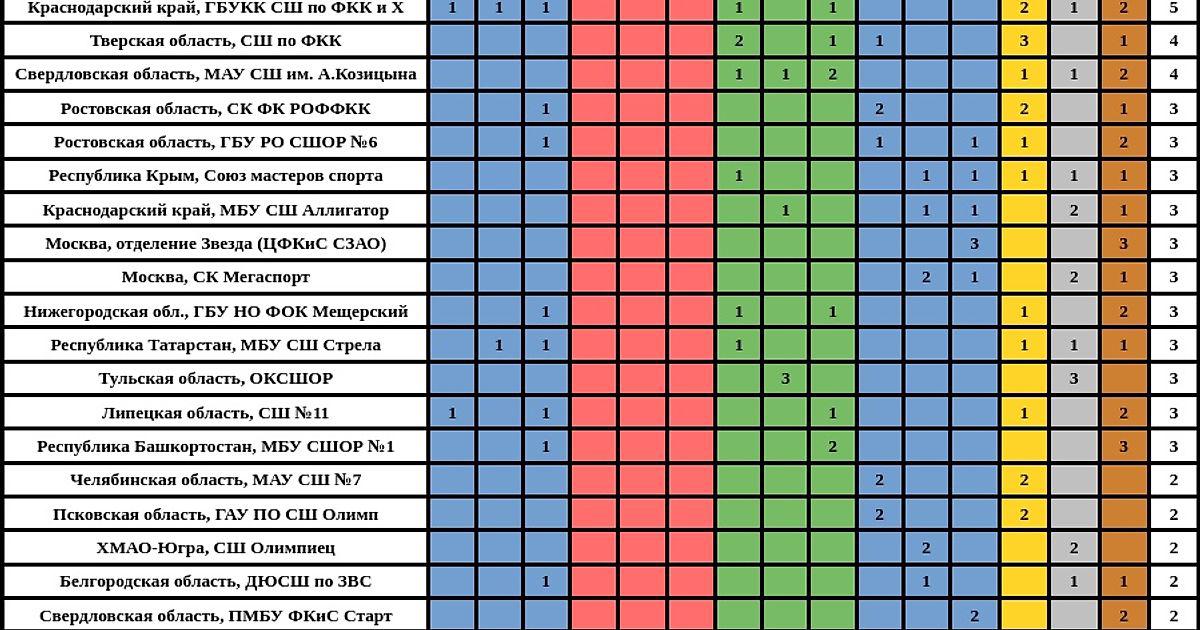 Закончились соревнования проводимые ФФКК России в этом сезоне.В таблице приведены призовые места школ по разрядам в российских соревнованиях(одиночное катание)-чемпионат,кубок,первенство,всероссийские соревнования среди взрослых,юниоров,младшего возраста,кроме межрегиональных соревнований.