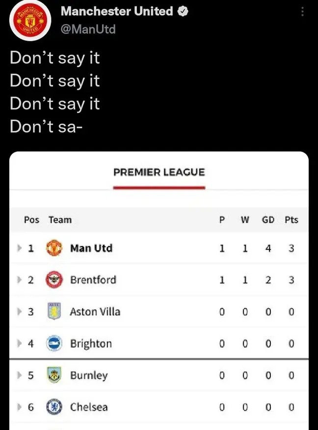 Кстати, это не первый твит «Юнайтед», который админ клубного твиттера удаляет в этом сезоне. Если помните, в первом туре АПЛ они разгромили «Лидс» 5:1,и после этого в соцсетях появился скриншот турнирной таблицы с «МЮ» на первом месте и подписью: «Не говори это».