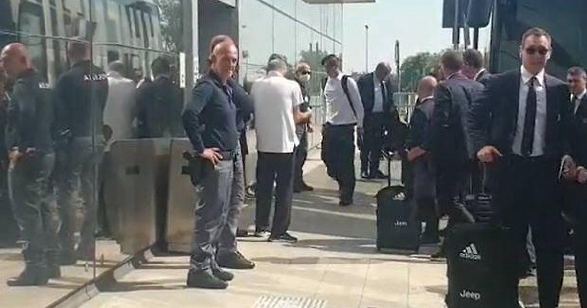 «Ювентус» летит в Рим, где завтра встретится с «Интером» в финале Кубка Италии: вот прибытие их автобуса в аэропорт Турин-Казелле.