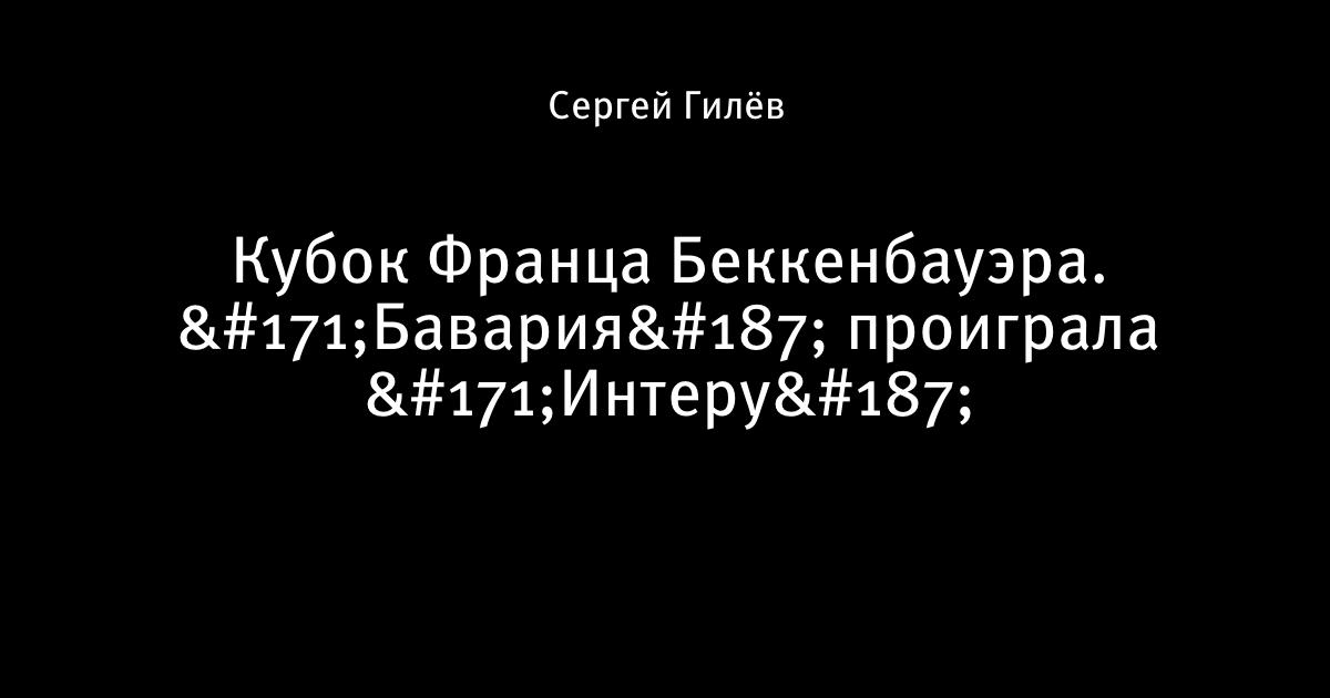 6 августа 2008, 01:14 Кубок Франца Беккенбауэра. «Бавария» проиграла «Интеру» Кубок Франца БеккенбауэраБавария Германия  Интер Италия  0:1 0:1  Мансини (52) Автор Сергей Гилёв Этот пост опубликован в блоге на Трибуне Sports.ru. Присоединяйтесь к крупнейшему сообществу спортивных болельщиков! Другие посты блога Разборки в олимпийском Париже