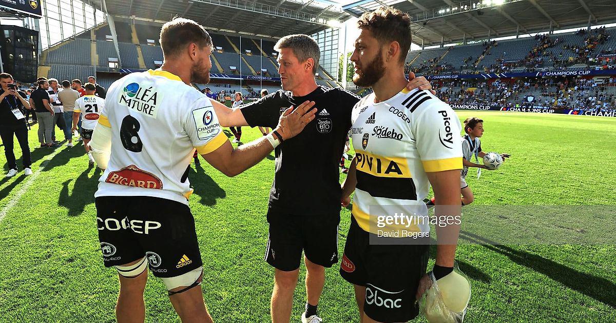 На фото Ронан О’Гара, главный тренер «Ля Рошель», празднует победу над «Расинг 92» с Вианом Либенбергом (слева) и Таверой Керр-Барлоу в полуфинале Кубка чемпионов Heineken 15 мая 2022 г.