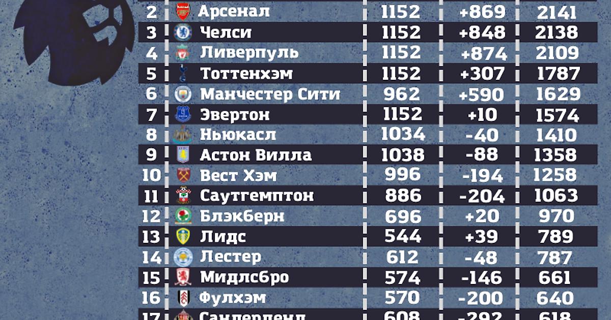 Топ! Тринадцать лучших команд Английской Премьер-лиги по сумме очков