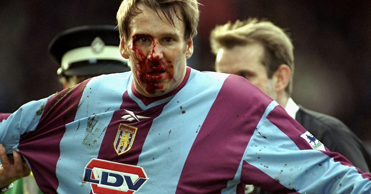 После двенадцатилетнего периода в лондонском "Арсенале", карьера Пола Мерсон пошла на спад. Игрок перешел за 5 миллионов фунтов в "Мидлсбро", а потом оказался в "Астон Вилле". На фото - Мерсон в футболке бирмингемского клуба с разбитым лицом после столкновения с игроком "Лидс Юнайтед". "Вилланы" в итоге победили 3:2 и прошли дальше. Кубок Англии, 2000 год.