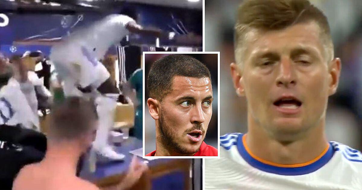 В соцсетях появились кадры, на которых Эден Азар в раздевалке предлагает шампанское 8-летнему сыну Тони Крооса. Немец явно был не в восторге! Тони сразу же отодвинул руку Азара с бутылкой.