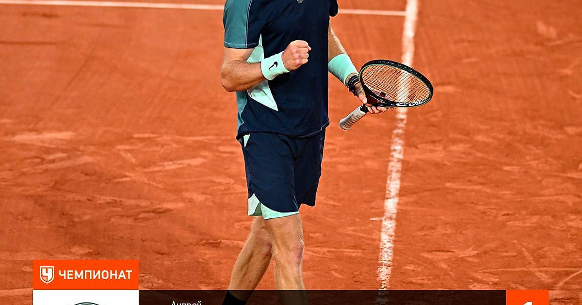Янник Синнер мощно провёл первый сет, но затем россиянин сумел выровнять игру, а в итоге итальянец снялся из-за травмы. В следующем раунде Рублёв встретится (https://www.championat.com/tennis/news-4711183-andrej-rublyov-proshyol-v-1-4-rolan-garros-yannik-sinner-otkazalsya-prodolzhat-match.html) с победителем пары Медведев — Чилич
