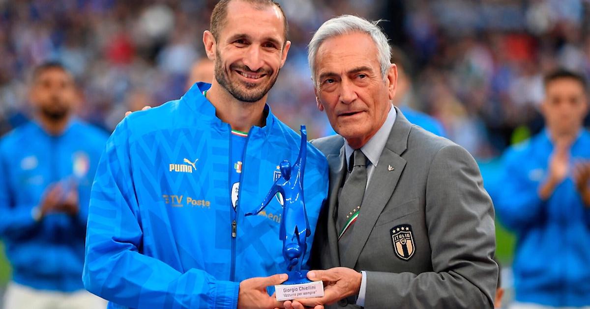 Кьеллини получил свою награду на «Уэмбли» из рук президента FIGC Габриэле Гравины перед началом матча Италия – Аргентина в день своего последнего выступления за национальную команду. Они даже крепко обнялись.