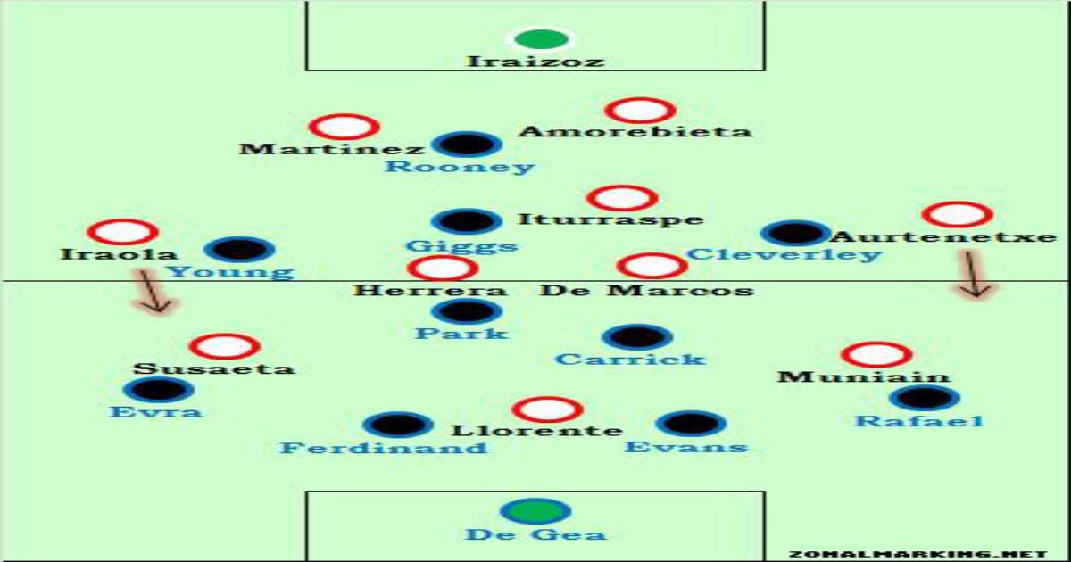 Правда, стоит отдать должное Юнайтед, они понимали вызов, с которым пришлось столкнуться, и предпринимали попытки быть более активными, чем в первом матче, за счет более плотной опеки. Когда Гиггза встретил Итурраспе, все игроки в центральной зоне уже были перекрыты, что дало возможность центральным защитникам просто вынести мяч из своей зоны. Хави Мартинес отлично с этим справился и создал шанс для Икера Муниана, который пробил в штангу. Джонни Эванс пытался сделать то же самое, но Атлетик накрыл его.