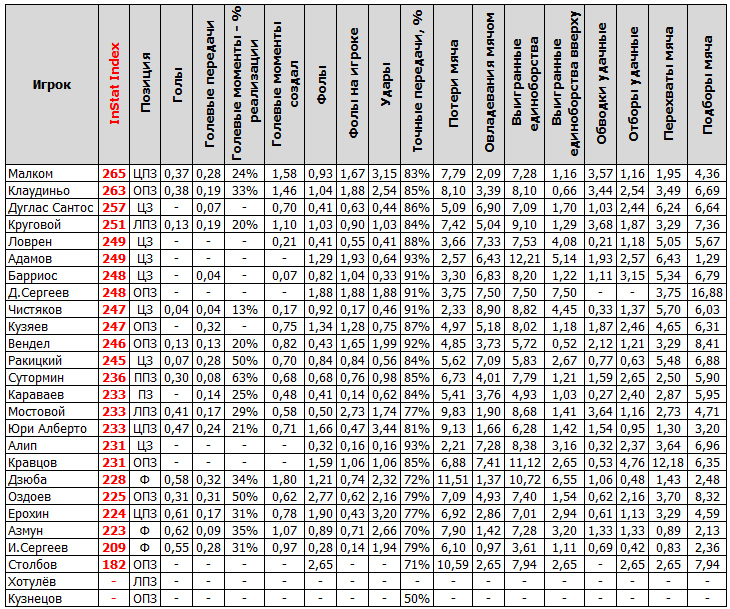 ▶ Показатели полевых игроков (в среднем за 90 минут)