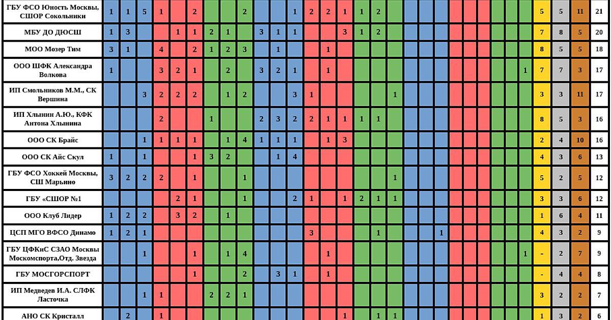 Закончились соревнования по фигурному катанию на коньках сезона 2021-2022 проводимые в г.Москве,Федерация фигурного катания на коньках г.Москвы. В таблице приведены призовые места школ на московских соревнованиях(одиночное катание).