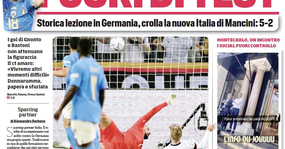 Лига Наций, исторический урок в Германии, крах новой Италии Манчини: 5:2. Голы Ньонто и Бастони не ослабили провала. Горечь главного тренера: «Переживём другие трудные моменты». Доннарумма, ошибка и вспышка гнева. Венгрия с успехом победила в Англии (4:0): Адзурри на третьем месте.