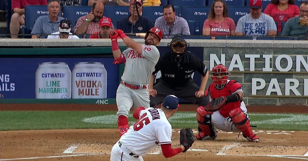 В 4 иннинге Кайл Шварбер выбил хоум-ран (18).Затем Ник Кастельянос выбил дабл (15) и Брайс Харпер прибежал в дом.
