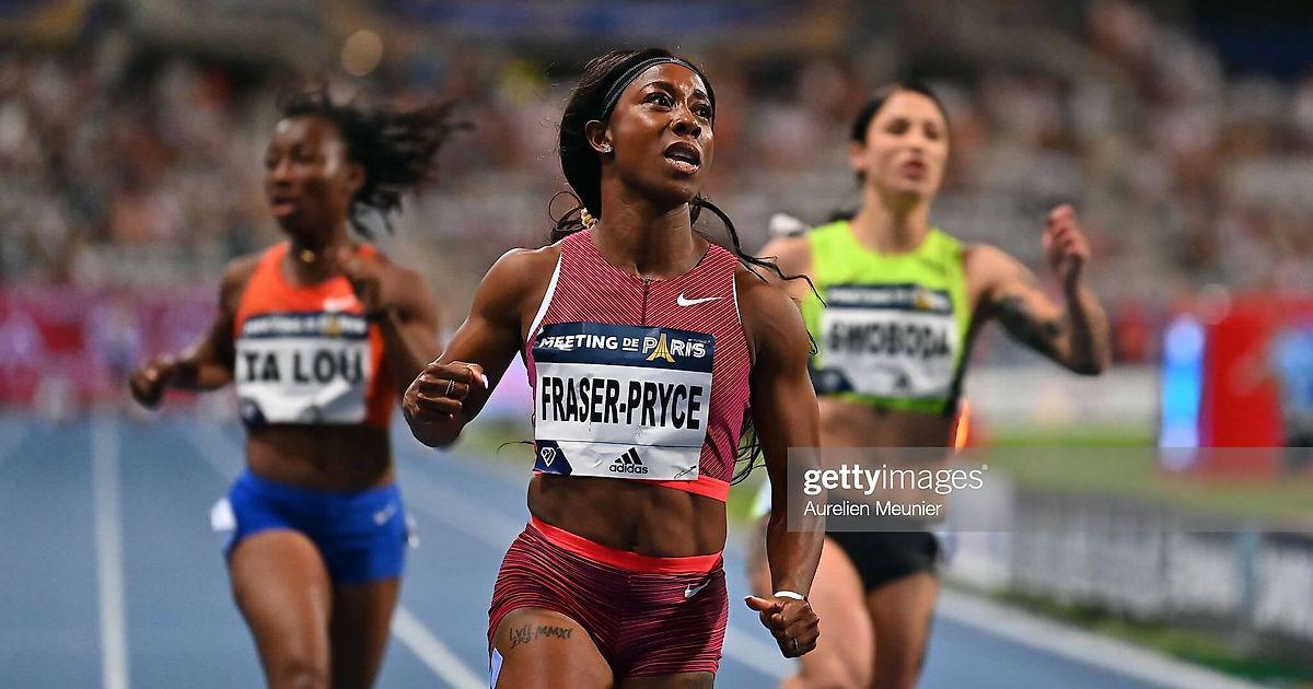 На фото Шелли-Энн Фрейзер-Прайс из Ямайки соревнуется в беге на 100 м среди женщин. Бриллиантовая лига 18 июня 2022 года в Париже, Франция.