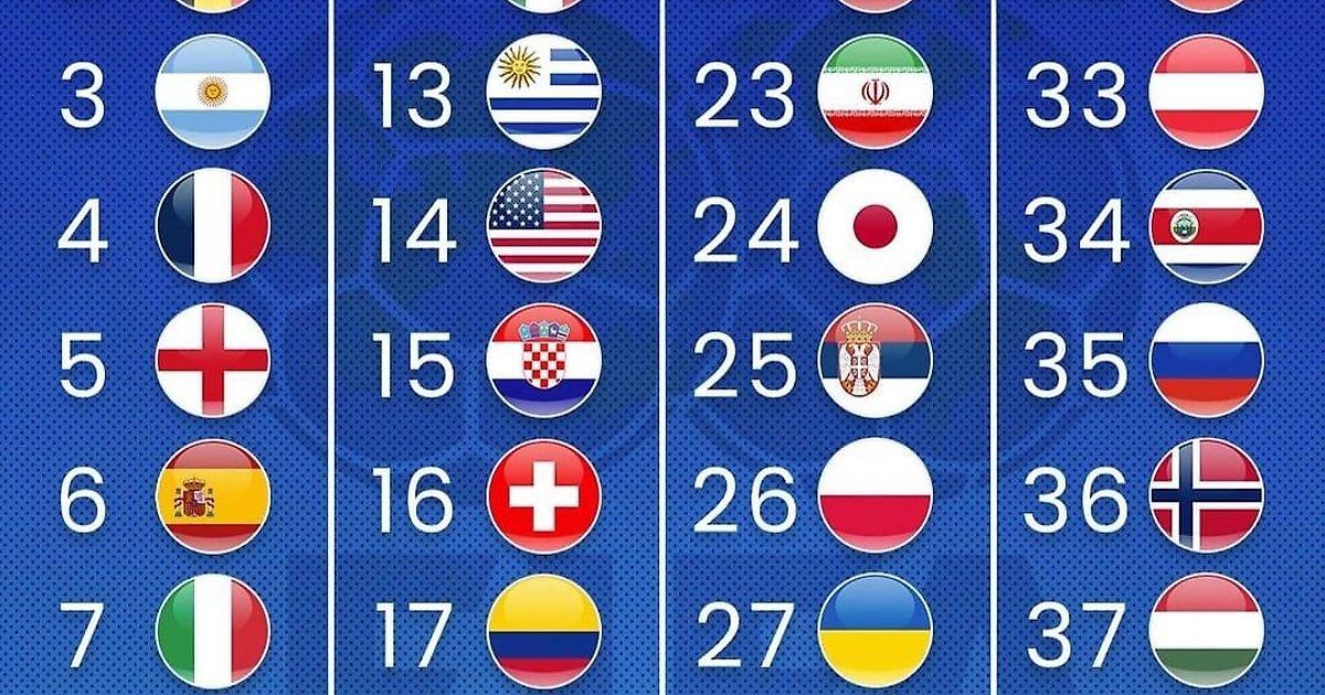 Вышел мировой обновлённый рейтинг ФИФА. Бразилия на 1 месте, Германия на 11