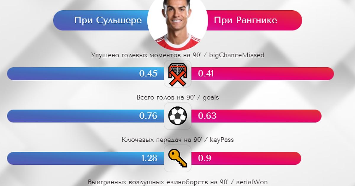 Передач под удар сделано больше при Сульшере, а вот на "втором этаже" Роналду был стабильно лучше при Рангнике.