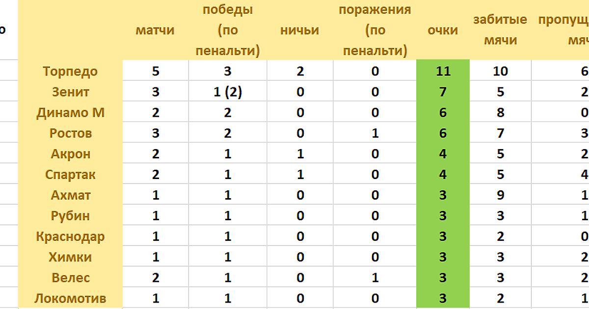 В турнирной таблице пока на первом месте Торпедо, потому что они сыграли больше всех матчей. Набрали 11 очков. На втором месте Зенит, который за три матча на кубке Пари набрал 7 очков, у них три победы, 2 из которых по пенальти. Динамо и Ростов сыграли 2 матча и одержали по 2 победы, в их активе 6 очков. Акрон и Спартак имеют по 4 балла. Далее следуют 6 команд, которые одержали по одной победе и имеют в активе по 3 очка.