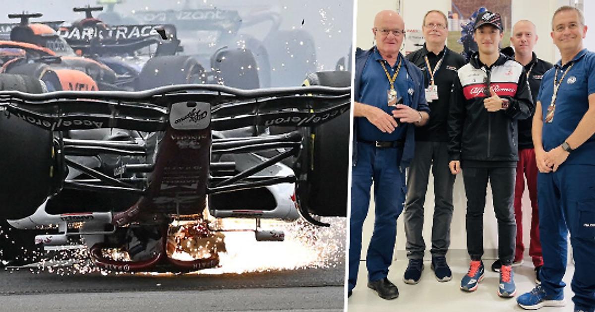 Новичка Чжоу из «Альфа Ромео» унесло вниз головой, машина пропорола пару сотен метров асфальта, а затем ухнула в трибуны – спасла только стальная решетка:
