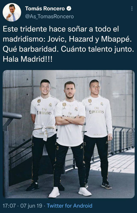 «Это трио взбудоражит всех: Йович, Азар и Мбаппе. Безумие! Сколько талантов вместе. Хала Мадрид!!!», - написал журналист Diario AS и болельщик «Реала» Томас Ронсеро еще в 2019 году.