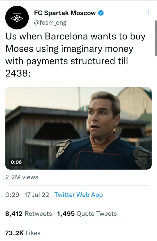 Пресс-служба московского «Спартака» в своих англоязычных соцсетях пошутила над каталонской «Барселоной», которая заявила о финансовых трудностях. Красно-белые высмеяли ситуацию выложив видео с участием актера Энтони Старра из сериала «Пацаны», представив, что сине-гранатовые приобретают у москвичей Виктора Мозеса.
