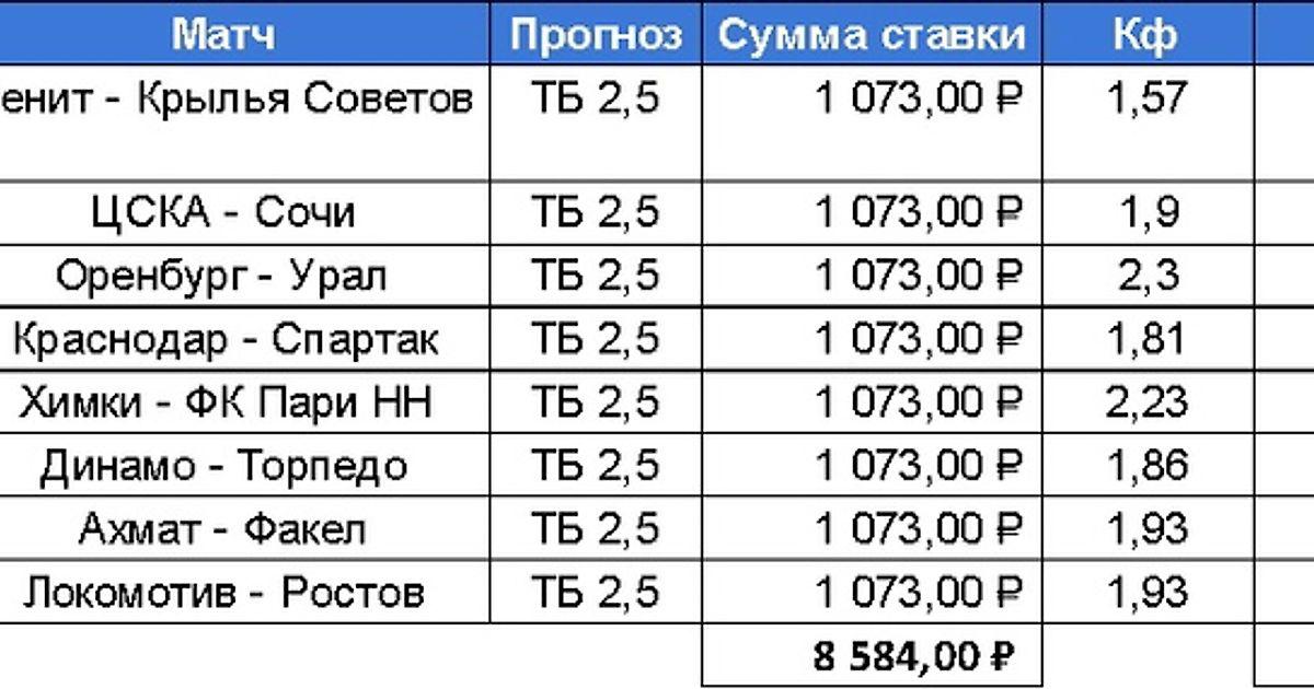 Изначально планировалось, что П2 за счет высоких коэффициентов зайдет хотя бы в 3 матчах и не будет убытка, а если зайдет в 4 из 8 матчей то будет плюс. Так не произошло, зашла лишь одна ставка на П2, выиграл Спартак. О победа Спартака, кстати, писал в своей телеге, правда думал что будет сухая победа Спартака.