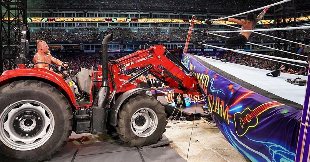 Чемпион появился в компании Пола Хеймана и Усо. Выходил он, как всегда, не торопясь, и потребовал у Нэшвилла признания. Брок сначала вышел на рампу, а затем отошел в сторону, забрался на трактор. Надел рубашку и шляпу, завел этот самый трактор, и доехал до ринга на тракторе. Даже попозировал в ковше этого самого трактора. А затем прервал анонсера и сам себя представил как человека, прибывшего надрать зад Романа Рейнса. А потом полетел на Романа с этого самого ковша, во время представления чемпиона. Серия ударов, и клоузлайн отправил самоанца за пределы ринга, где Брок шарахнул оверхэд-белли-ту-белли. Запуск в ступеньки последовал, а потом еще один белли-ту-белли с этих самых ступенек. Лэриэт у баррикады, и Леснар отправил оппонента в зрительский зал. Рефери все это время пытался считать, а «Зверь» провел еще и классический суплекс в зрительском зале. F5 Роман избежал, впечатав брока лицом в металлическую стойку, хотел провести бомбу, но Брок направил его спиной в эту же стойку, сбросив затем на оператора. Еще один отсчет, и Леснар вернул соперника, да и себя рингсайд, где прошел еще и немецкий суплекс. Пока Роман поднимался на ноги, Брок вытащил из под ринга стол, установив его рядом. Хейман отвлек на себя внимание бывшего клиента, выиграв Рейнсу несколько ценных минут, и тот шарахнул самоан дроп на стол.Брок поднялся на ноги, получил еще и ступеньками по голове, и судья снова стал считать. До 6. Роман установил тем временем еще один стол. Чемпион провел еще и uranage на стол. Брок поднялся на счет 7. Борцы вернулись в ринг. Рейнс зарядил супермэн панч. Который, конечно же, достиг цели, но Брок очень быстро поднялся на ноги. Еще один супермэн панч. Гарпун! На счет 7 «Зверь» вновь поднялся, а потом чуть не реверсировал гарпун в F5. Рейнс ушел от этого дела, но был послан на рингсайд. Здесь претендент провел слэм на остатки стола. Рейнс поднялся на счет 8, а Леснар снова завел трактор… отодвинул его назад чуть-чуть и зарядил противнику ступеньками в голову. А затем еще раз куском стола. Роман встал на счет 8. Тогда Брок уложил его на ковш трактора и сбросил из ковша в ринг. Снова не до 10, а фанаты стали чантить «This is Awesome!». Брок провел 2 немецких суплекса. Третий. F5. Каждый раз Роман поднимался, последний — на счет 9 с половиной. Еще один F5 Рейнс реверсировал в гильотину, но Брок реверсировал ее в собственную гильотину. Очередной отсчет до 9, и Роман снова встал. Тогда «Зверь» снова забрался в свой трактор, и стал двигать им ринг. А потом он загнал ковш под ринг, подняв им угол ринга! Роман, как колобок, укатился на рингсайд. Судья снова стал считать, Рейнс опять поднялся, а фанаты стали чантить «This is Awesome!».