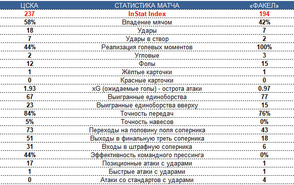 Счёт матча в соответствии с xG (ожидаемыми голами) – 2:1 в пользу ЦСКА. Счёт матча в соответствии с xG (ожидаемыми голами) по моментам с игры – 1:0 в пользу ЦСКА. Лучший игрок матча по версии эксперта канала Матч-Премьер – Хорхе Карраскаль. Лучшие игроки матча по версии InStat Index – Хорхе Карраскаль (273), Хесус Медина (267), Константин Кучаев, Фёдор Чалов (по 263).