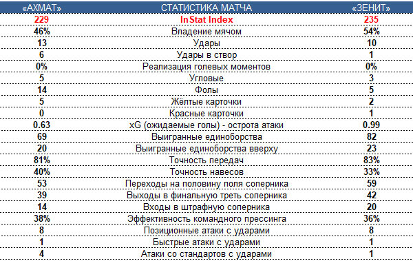 Счёт матча в соответствии с xG (ожидаемыми голами) – 1:0 в пользу «Зенита». Лучший игрок матча по версии эксперта канала Матч-Премьер – Лечи Садулаев. Лучшие игроки матча по версии InStat Index – Вендел (286), Лечи Садулаев (268), Юрий Журавлёв (265).