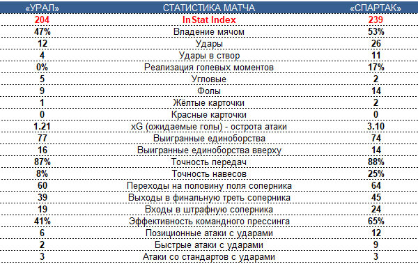 🕮 Факты: ◉ «Урал» впервые в своей истории начал сезон в чемпионате России с четырех поражений подряд. ◉ «Спартак» забил 11 голов в стартовых четырех турах этого сезона. Только в сезоне-1994 спартаковцы забивали больше голов после первых четырех туров в чемпионате России (12). ◉ Спартаковец Михаил Игнатов забил свой второй гол в РПЛ. Первый был еще в октябре 2018 года – в игре против «Енисея». ◉ Александр Соболев впервые в карьере сделал две голевые передачи в матче РПЛ. У него восемь голевых действий (5+3) в восьми матчах против «Урала» в РПЛ - больше, чем против любого другого соперника. ◉ «Спартак» прервал серию из девяти матчей, по ходу которой он и забивал, и пропускал. ◉ 100-й матч в РПЛ сыграл полузащитник «Урала» Даниел Мишкич. ◉ При судействе сочинца Павла Кукуян «Спартак», сыграв 13 матчей, не потерпел ни одного поражения.