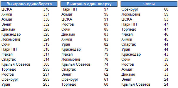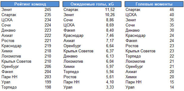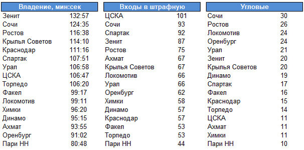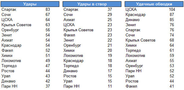 Сколько ваша любимая команда совершает ударов по чужим воротам, создает голевых моментов, как долго владеет мячом, как часто фолит, отбирает мяч, насколько уверенно чувствует себя в единоборствах. Именно об этом пойдет речь в нашем статистическом материале. Подводим итоги туров с первого по четвёртый. Пять блоков по три таблицы.
