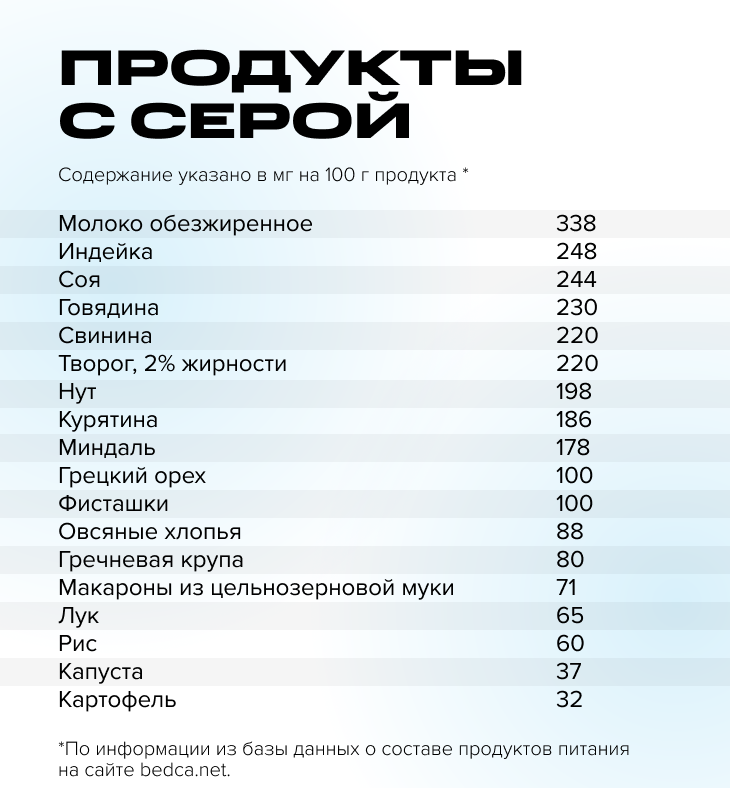 Роль серы в организме. Чем опасна нехватка или избыток. В каких продуктах содержится